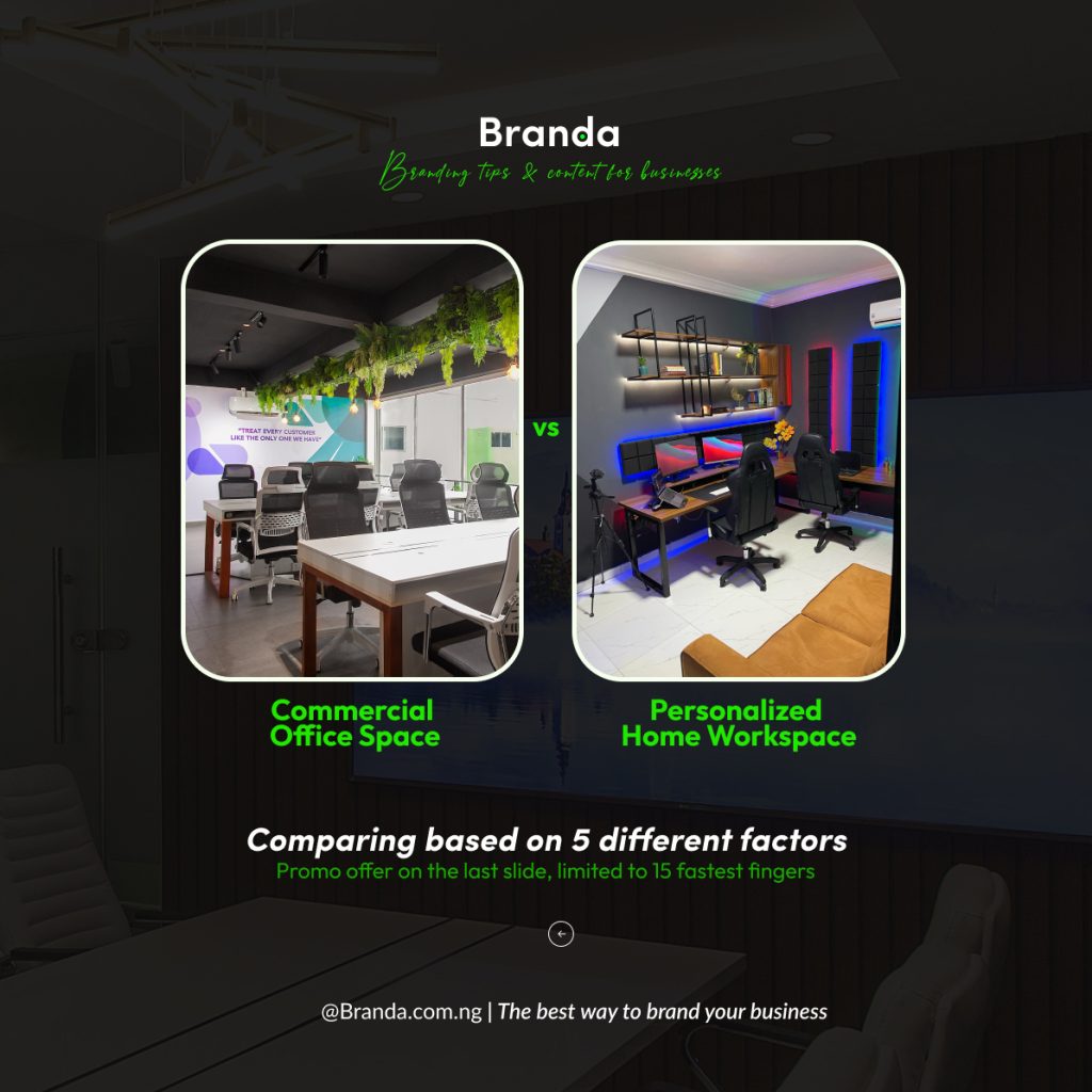 let’s compare a commercial office and a personalized home workspace based on different factors and rank them from 1 to 5 (1 being the best or highest and 5 being the lowest or least favorable).